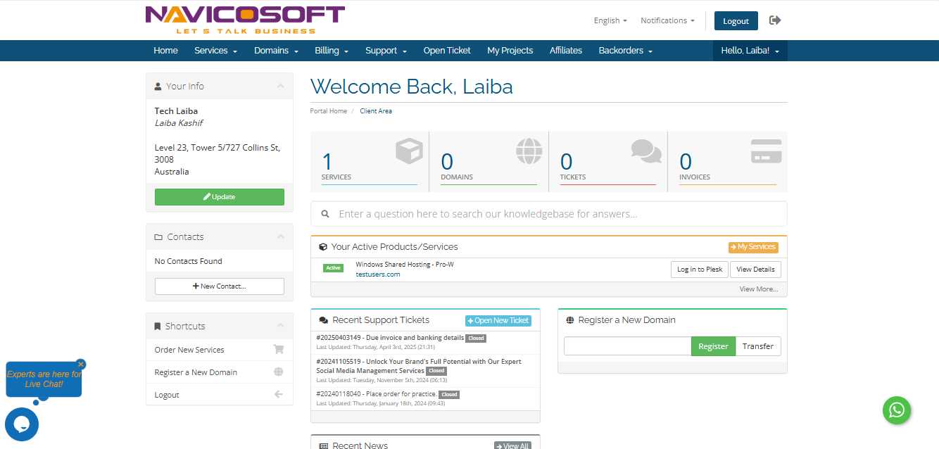 3. That's it! You've successfully logged in to your client area. On successful login, you will see the following screen: