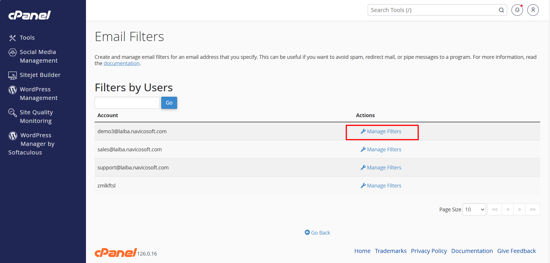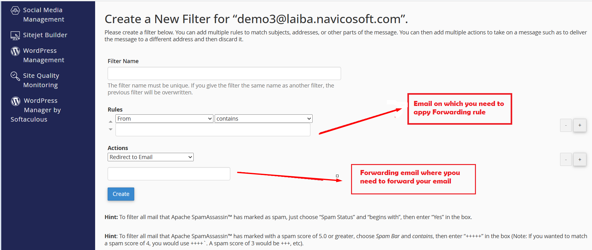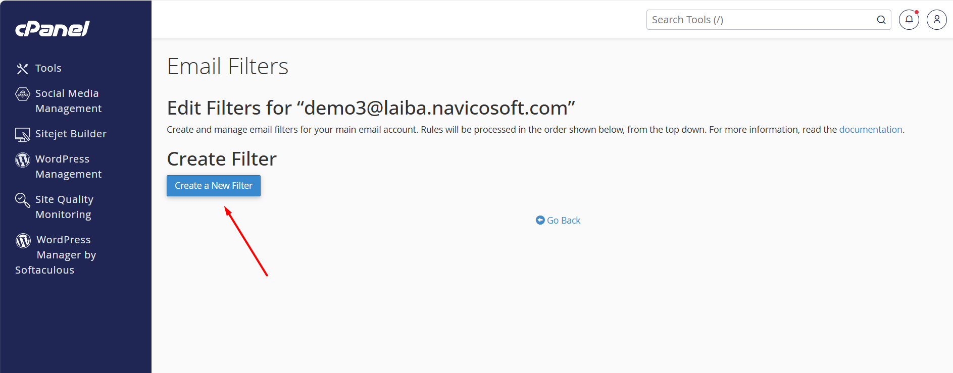 - Search your email account where you need to set email forwarding and click on Manage Filters >> Create a New Filter.