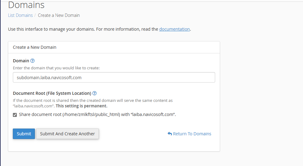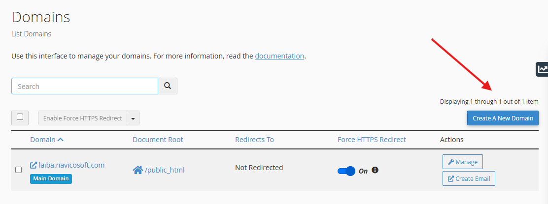 - Once created, the subdomain will appear in the Domains section of cPanel