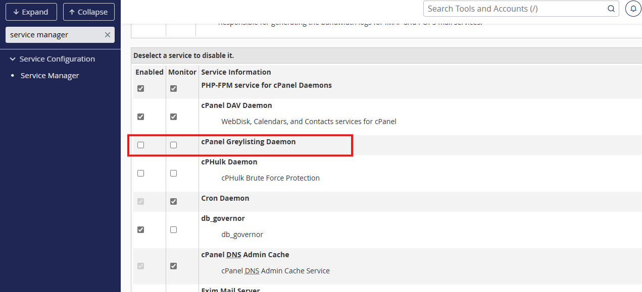 - The "cPanel Greylisting Daemon" service in WHM's Service Manager (look for it in WHM under Home, then Service Configuration, and finally Service Manager).