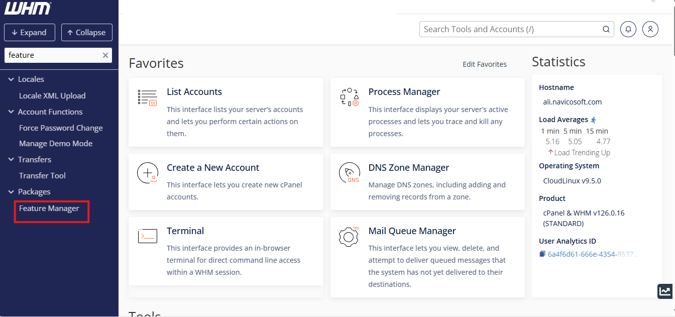 - The "Configure Greylisting" option in WHM's Feature Manager (you can find it in WHM under Home, then Packages, and finally Feature Manager).