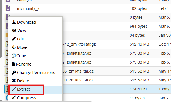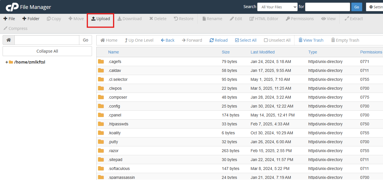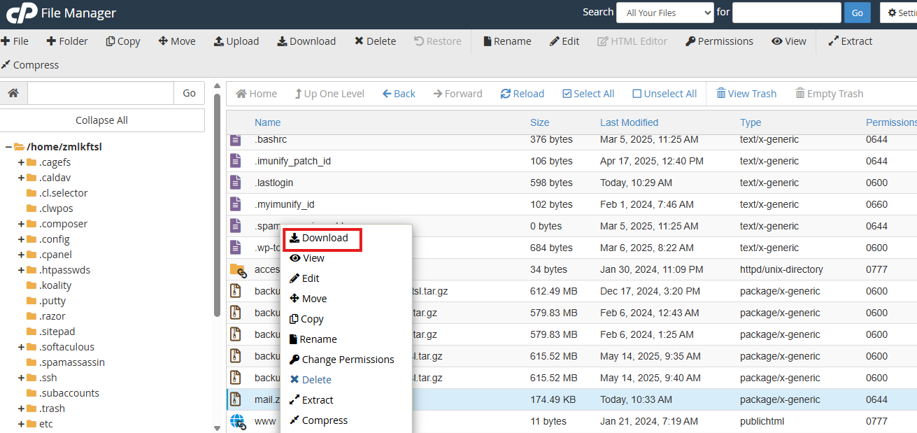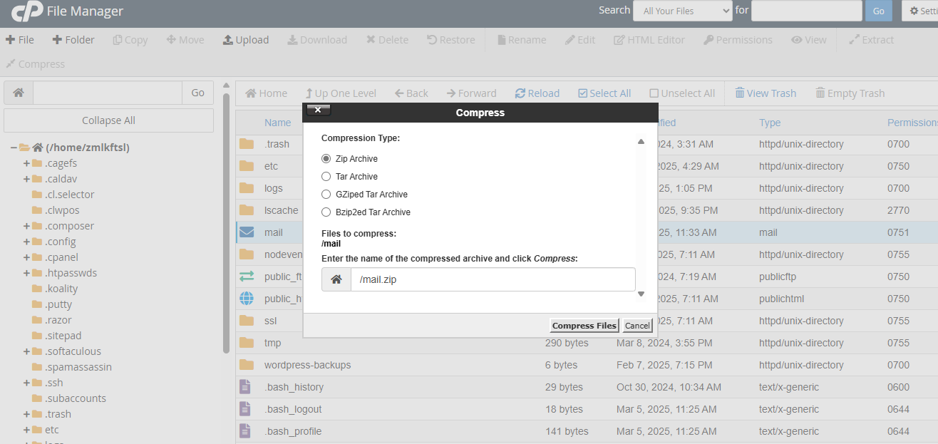 - Upload the mail zip file we created earlier and extract it in the /home directory.