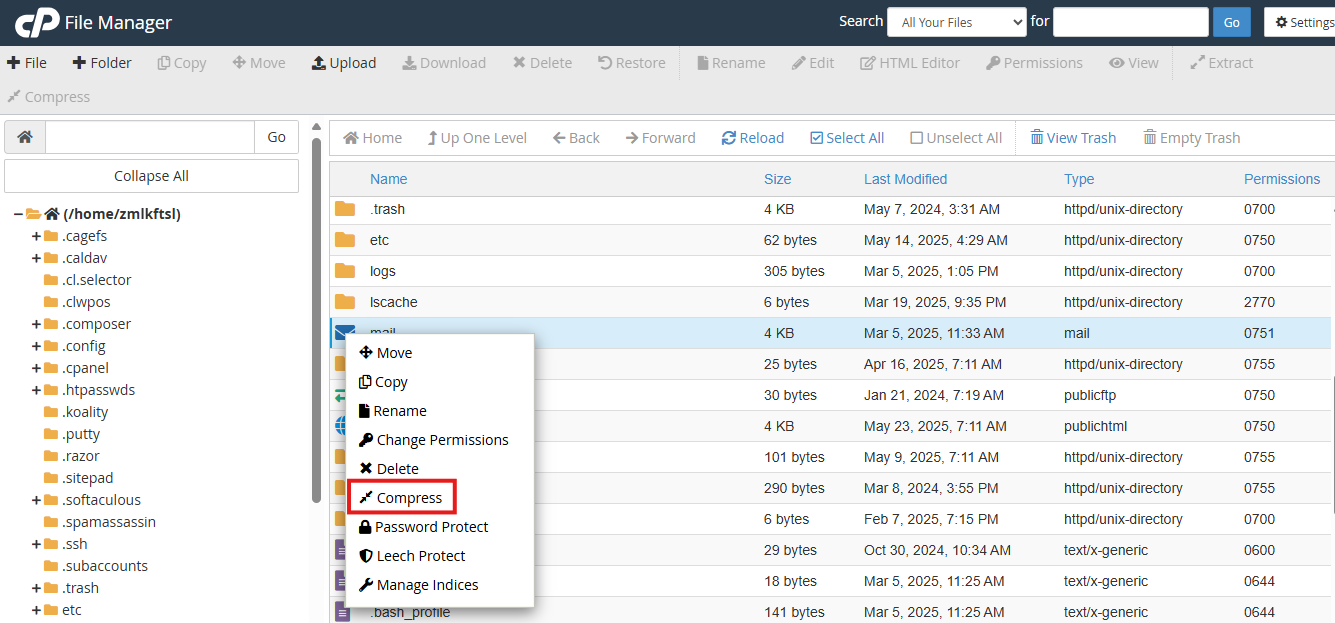 - Here, you will find all the files/folders. Right-click on Mail Folder and compress it.