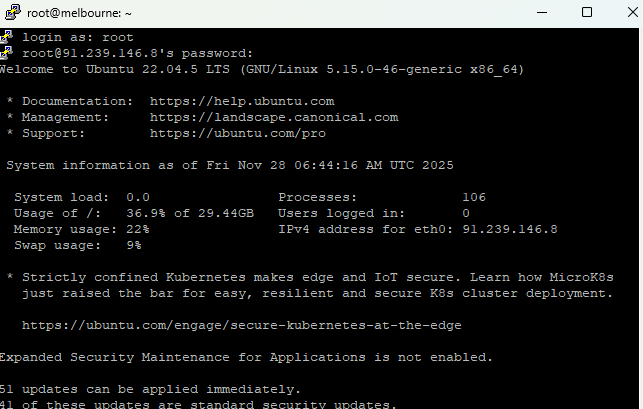 You’re now successfully connected to your VPS via SSH using PuTTY! 🎉
