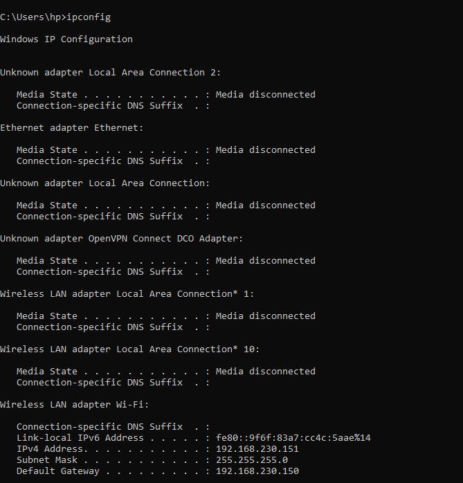 Lists all active interfaces with details like IP address, MAC address, subnet mask, and status.