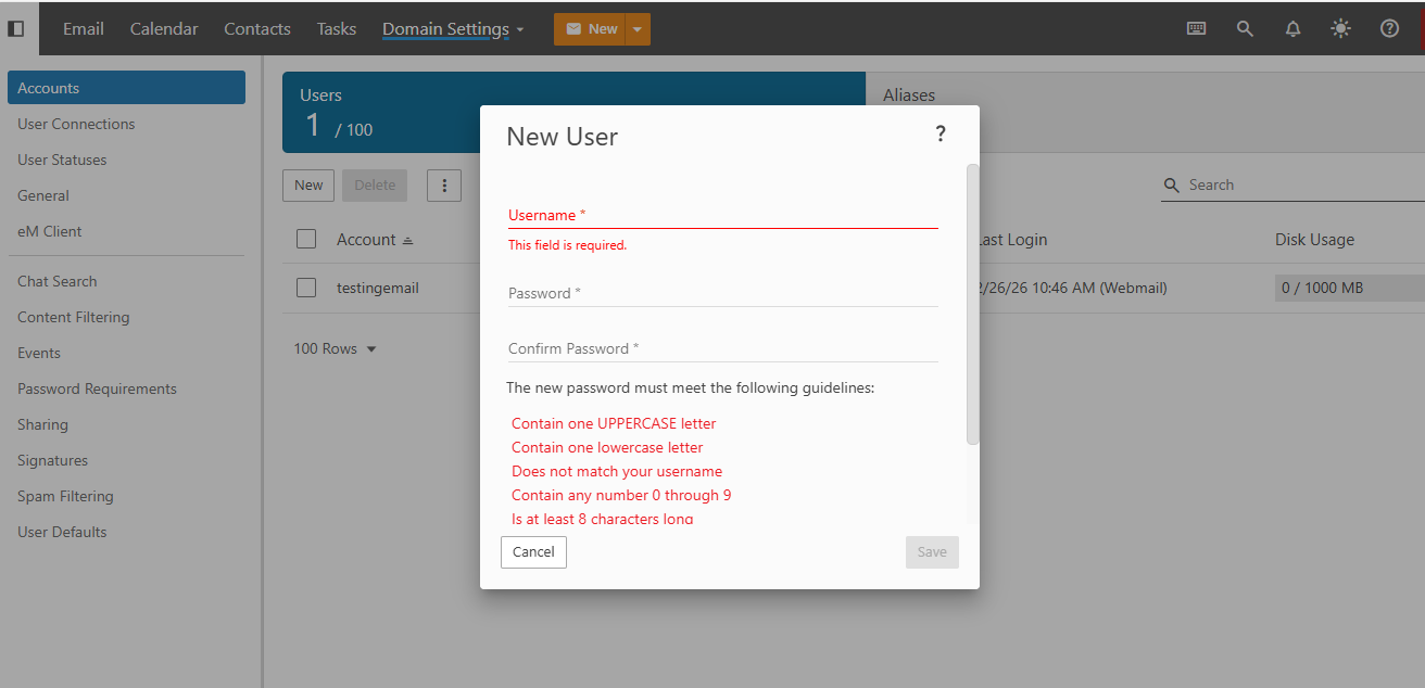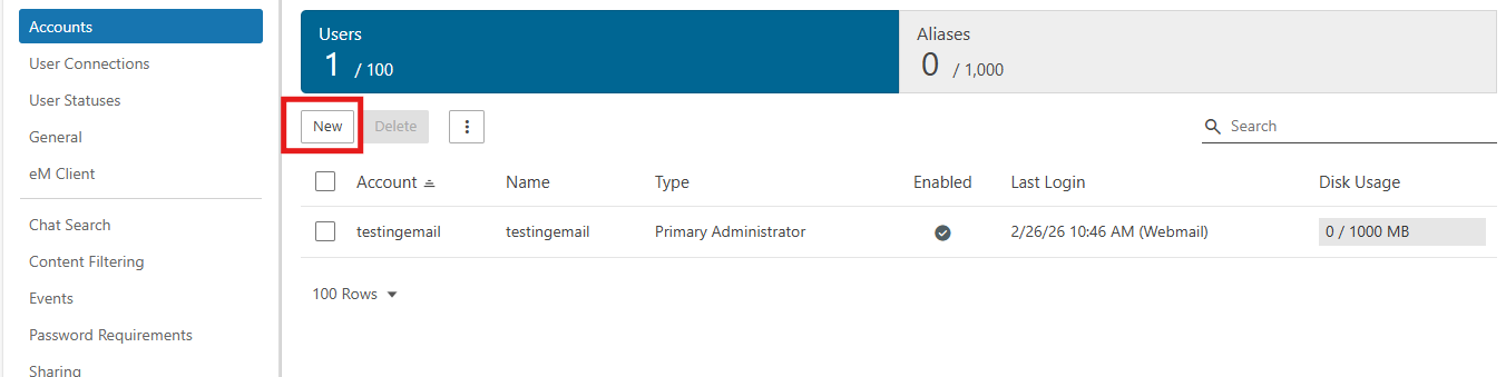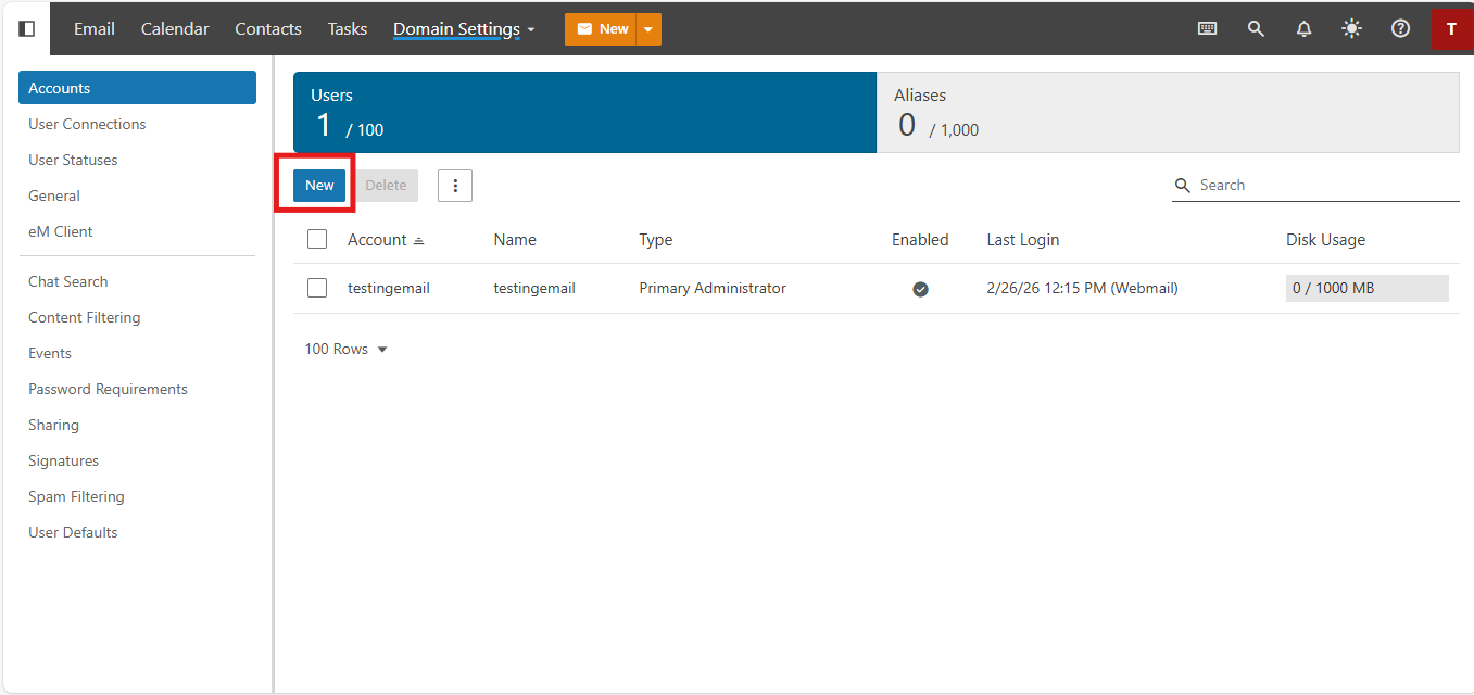 Note: Only the domain administrator has the authority to create email accounts. If you would like to obtain administrator rights for your email account, please submit a ticket using your primary email address so that we can grant domain administrator access for your email account.