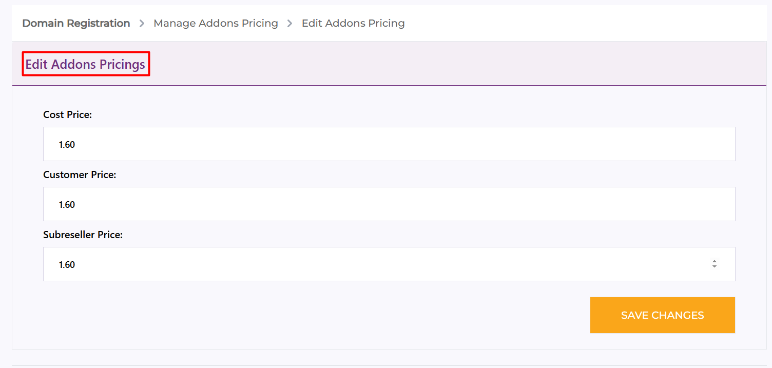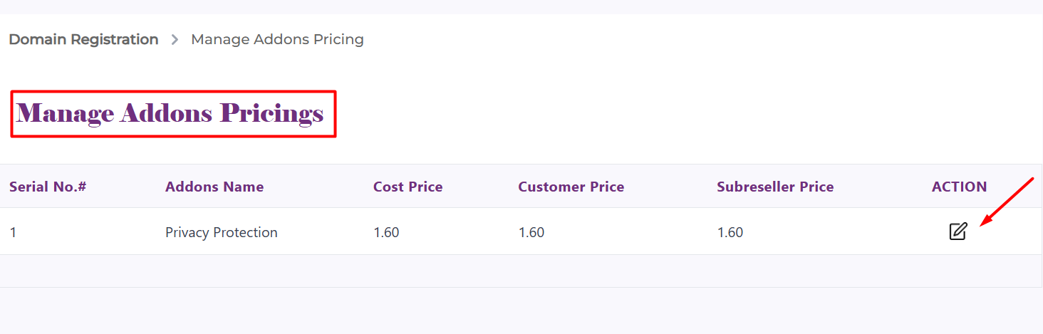On the Domain Registration page, click on the Manage Addons Pricing option to access all the addons you offer.