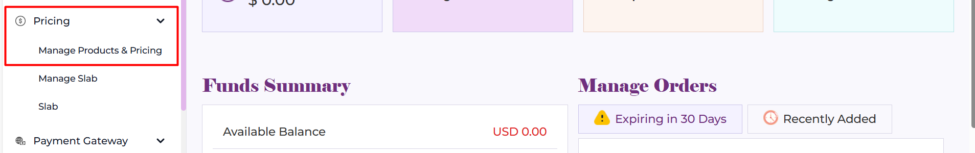 In the left-hand sidebar, click on Pricing, then select Manage Product & Pricing from the dropdown menu.
