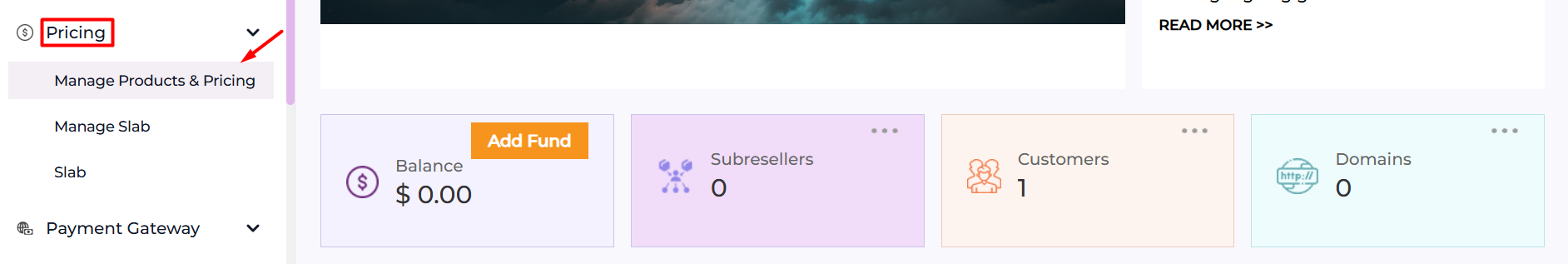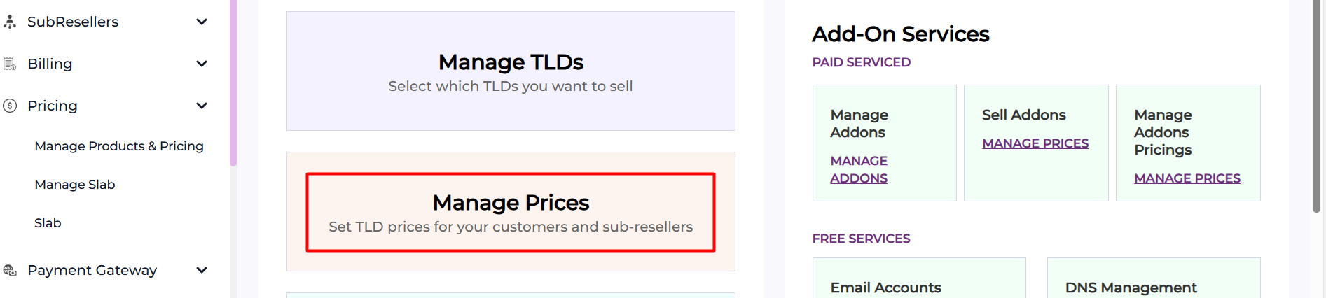 - On this page, click on the "Manage Pricing" button to access the domain pricing settings.