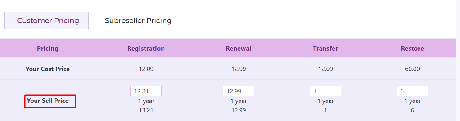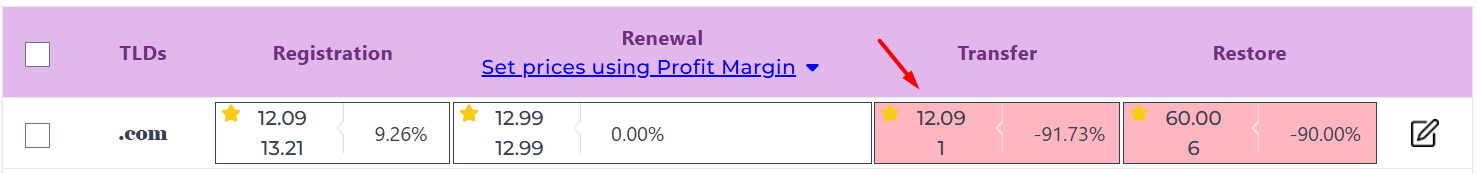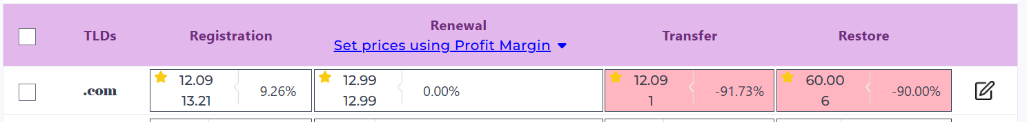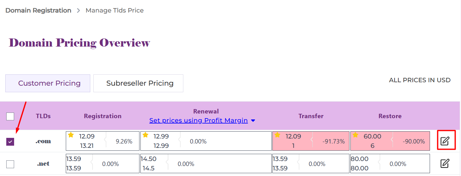- Once the TLD is selected, an edit icon will appear on the right side. Click on the edit icon to proceed to adjust the pricing.