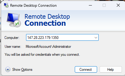 6- To connect to the Remote Desktop on this Windows computer using a custom RDP port, enter the port number in the mstsc.exe client after the IP address or hostname, separated by a colon, like this: RDPComputerName:1350 or by IP address: IP ADDRESS:1350 or from the command prompt: mstsc.exe /v IP ADDRESS:1350