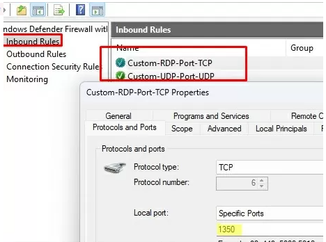 New-NetFirewallRule -DisplayName "NewRDPPort-UDP-In" -Direction Inbound -LocalPort 1350 -Protocol UDP -Action Allow(Or manually via Windows Defender Firewall → Inbound Rules.)