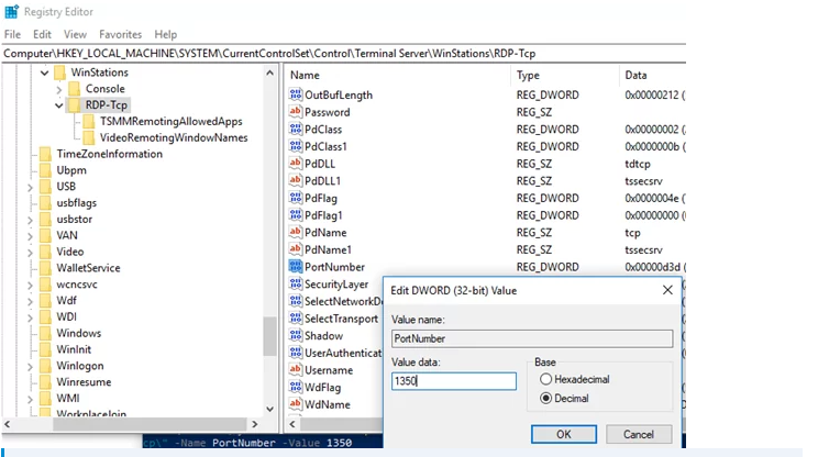 You can change the registry parameter by using PowerShell: Set-ItemProperty -Path "HKLM:\System\CurrentControlSet\Control\Terminal Server\WinStations\RDP-Tcp\" -Name PortNumber -Value 1350