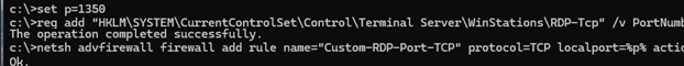 set p=1350reg add "HKLM\SYSTEM\CurrentControlSet\Control\Terminal Server\WinStations\RDP-Tcp" /v PortNumber /t REG_DWORD /d %p% /fnetsh advfirewall firewall add rule name="Custom-RDP-Port-TCP" protocol=TCP localport=%p% action=allow dir=INnetsh advfirewall firewall add rule name="Custom-UDP-Port-UDP" protocol=UDP localport=%p% action=allow dir=INnet stop TermService /ynet start TermService