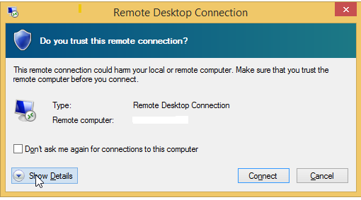 Once you have clicked on Connect, you will be prompted if you trust this connection. If you do and do not want to see this message again, check the box beside “Don’t ask me again for connections to this computer.” Also, if you would like to connect your local drives, printers, or clipboard, click on the Show Details at the bottom left.