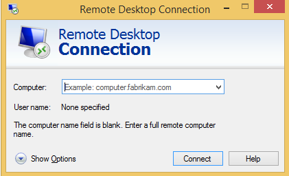 When you have opened Remote Desktop Connection, you must enter the computer name or IP address of the computer/server. Once you have entered either one, click Connect.